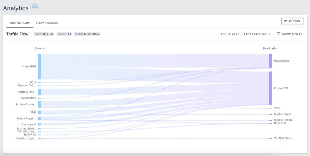 Release 15.4 adds a Palo Alto IOT Security Connector. Device attributes learned via connectors can now be manually refreshed as desired, rather than waiting out a 24-hour automated refresh. 15.4 also adds new (beta) analytics for network traffic: a Sankey chart view and a flow table view.