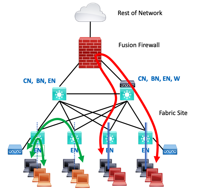 The “top” tier is virtual networks or VN’s. These are actually VRF’s in terms of implementation: separate routing domains. The SD-Access switches provide no direct way for traffic to move between VN’s. Instead, an external device is used. A “fusion router” connects to the various VN’s (VRF’s in its configuration), either leaking routes or exchanging routes selectively with global routing. A “fusion firewall” does the same thing, generally treating the VRF’s as different zones and applying stateful enforcement.