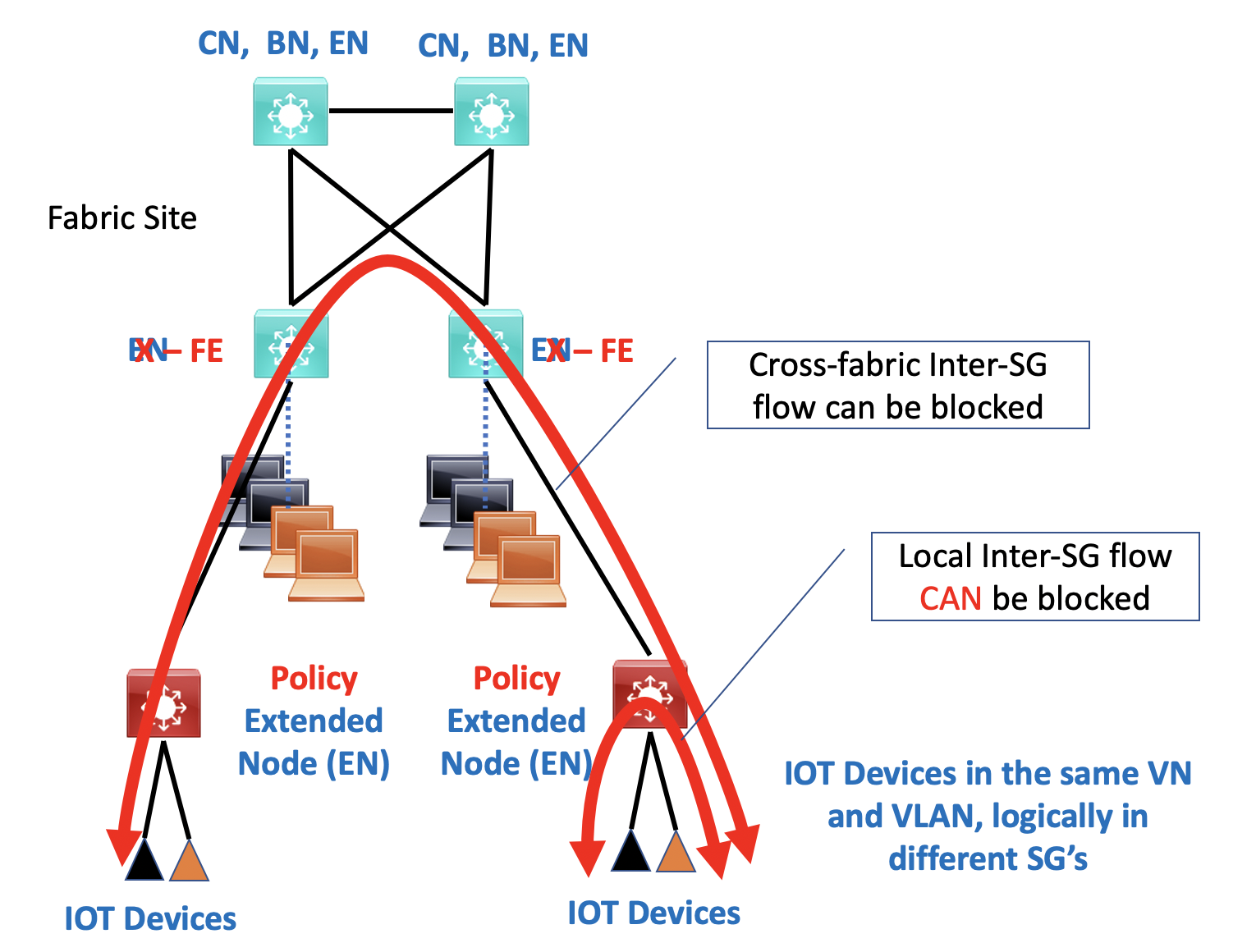 So, with EN’s, you could have multiple types of devices sharing a VLAN and VN. They’ll be able to talk to each other via local switching even if they logically are in different SG’s. They won’t be able to talk to a device in a different SG on another EN if you have an SGT policy forbidding that.